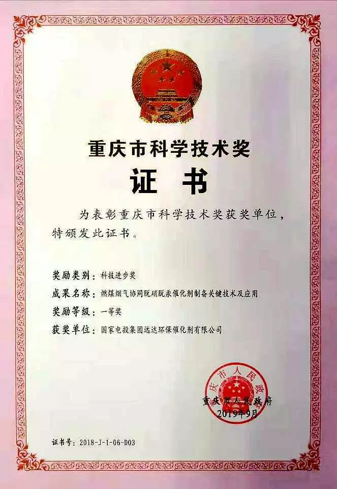 10月17日,重庆市举行2018年度科学技术奖励大会。中央政治局委员、市委书记陈敏尔,市长唐良智等领导出席大会并为获奖代表颁奖。其中,m88官网催化剂公司联合m88官网工程公司、重庆大学申报的“燃煤烟气协同脱硝脱汞催化剂制备关键技术及推广应用”项目,经过前期申报、形式审查、综合评审、现场评审答辩、专家评分等环节的激烈角逐,在数百个优秀项目中脱颖而出,荣获2018年度重庆市科技进步奖一等奖。